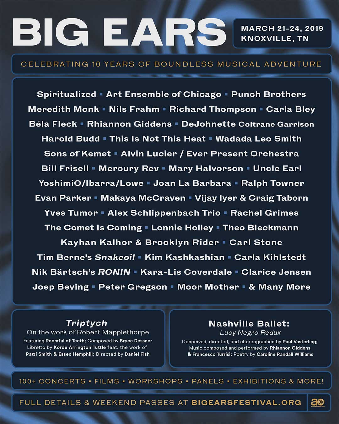 The Big Ears Festival has just announced their final lineup for its tenth-anniversary, March 21-24, 2019, featuring Spiritualized, Punch Brothers, Bela Fleck, Bill Frisell, Art Ensemble of Chicago, and many more! A festival unlike any other, Big Ears offers more than 100 performances plus a film festival, workshops, talks, exhibitions, and a 12-hour drone concert all in downtown Knoxville, Tennessee. Explore the full lineup and event details at bigearsfestival.org